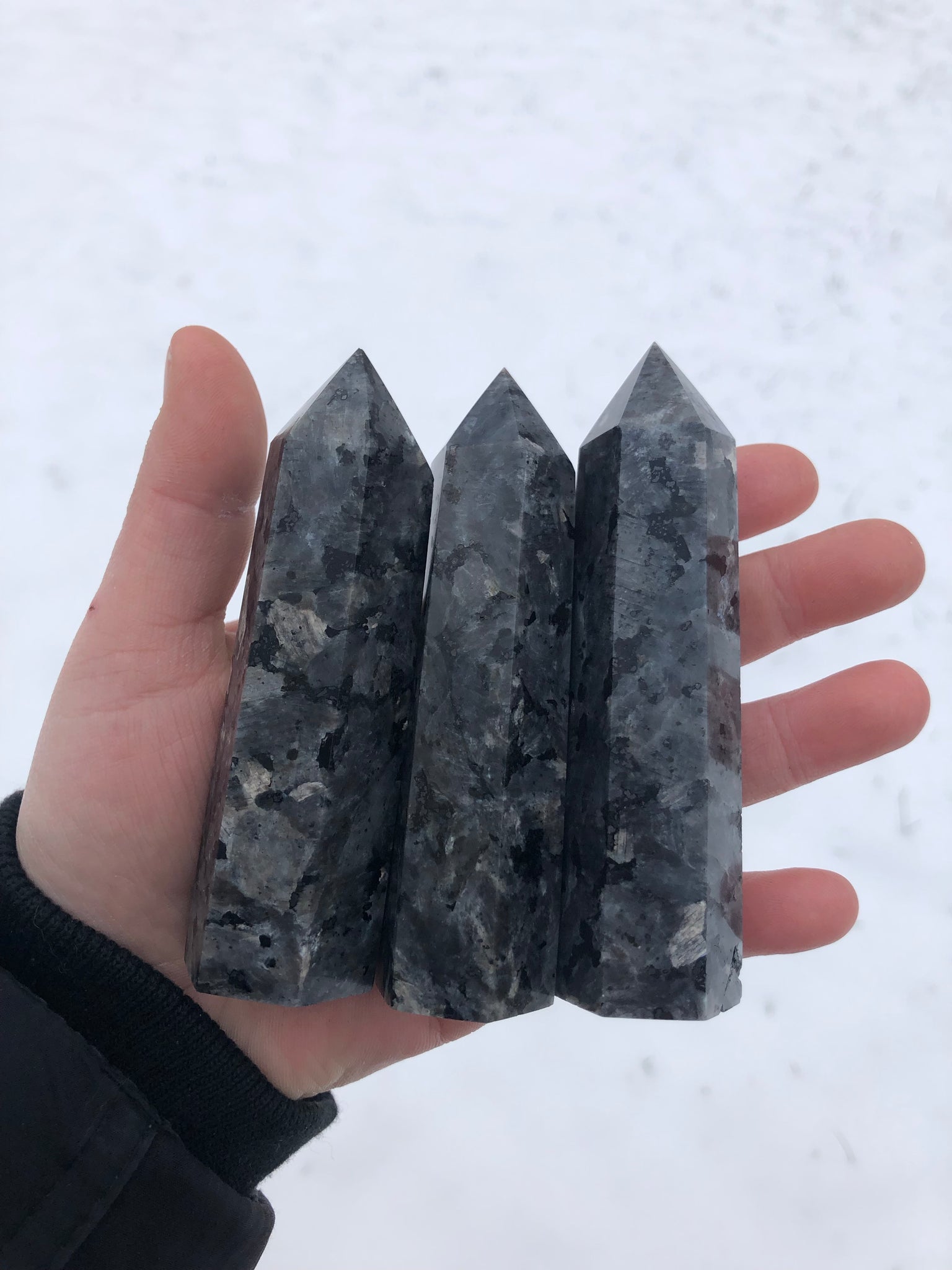 Larvikite towers. Larvikite brings strength, creativity & wisdom. Larvikite can also enhance psychic abilities. Amazing flashes! Please allow for natural variations. Size, shapes & colors may vary. You will receive one intuitively selected piece. Approximately 4” in height.