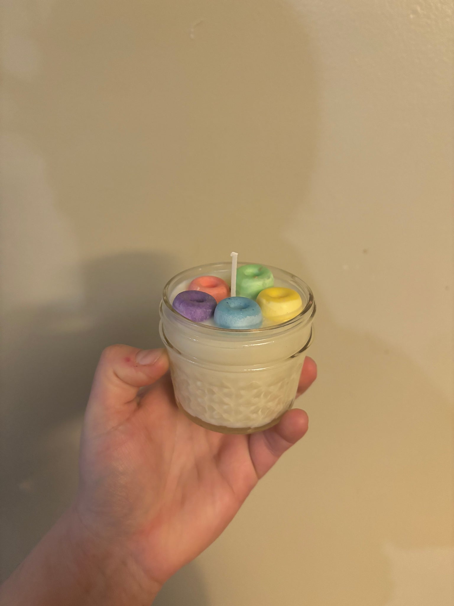 “Fruity Loops” Scented 4 oz Candle. Handmade with soy wax. Smells just like the infamous cereal. Topped with wax fruity loops. Smells amazing! Do not eat!