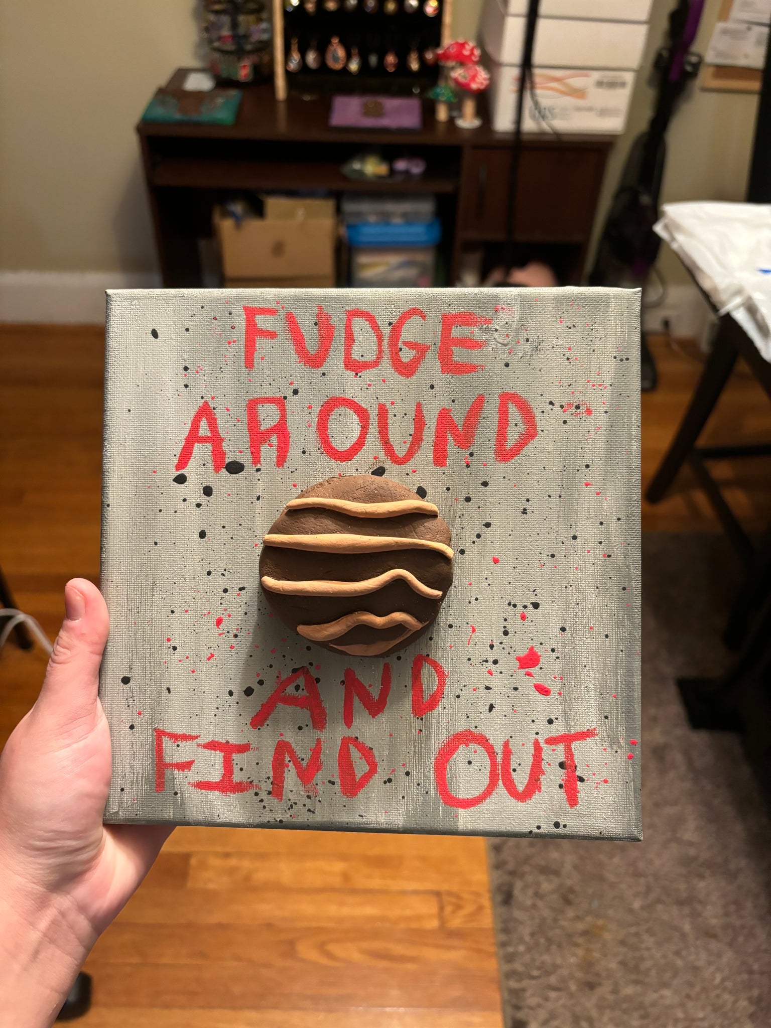 “Fudge Around & Find Out” 3D Fudge Round Artwork Handmade with clay & hand painted acrylic paint. On an 8” by 8” canvas. I thought is quote was super funny. Spice up your walls with this delicious snack cake art piece. 😂