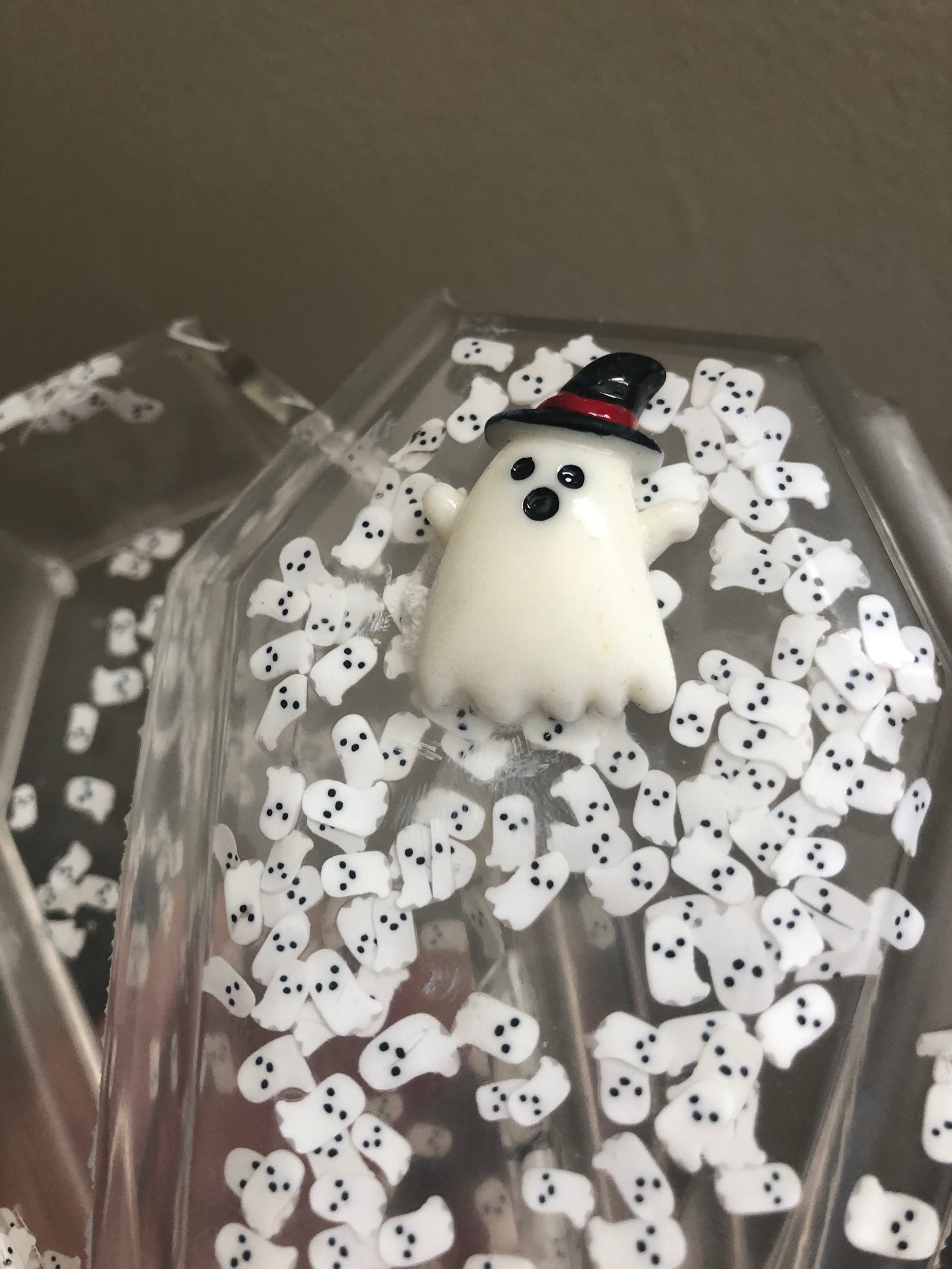 Ghost coffin trinket box. Handmade with epoxy resin. Features adorable ghost sprinkles throughout & a little ghost wearing a witch hat on top! The perfect stash box, jewelry box or whatever you’d like it to be. (Has some flaws like the top not filling all the way, but it’s not extremely noticeable & some adhesive around the ghost on top may be noticeable) 5” by 3” inches & about 2 inches deep.