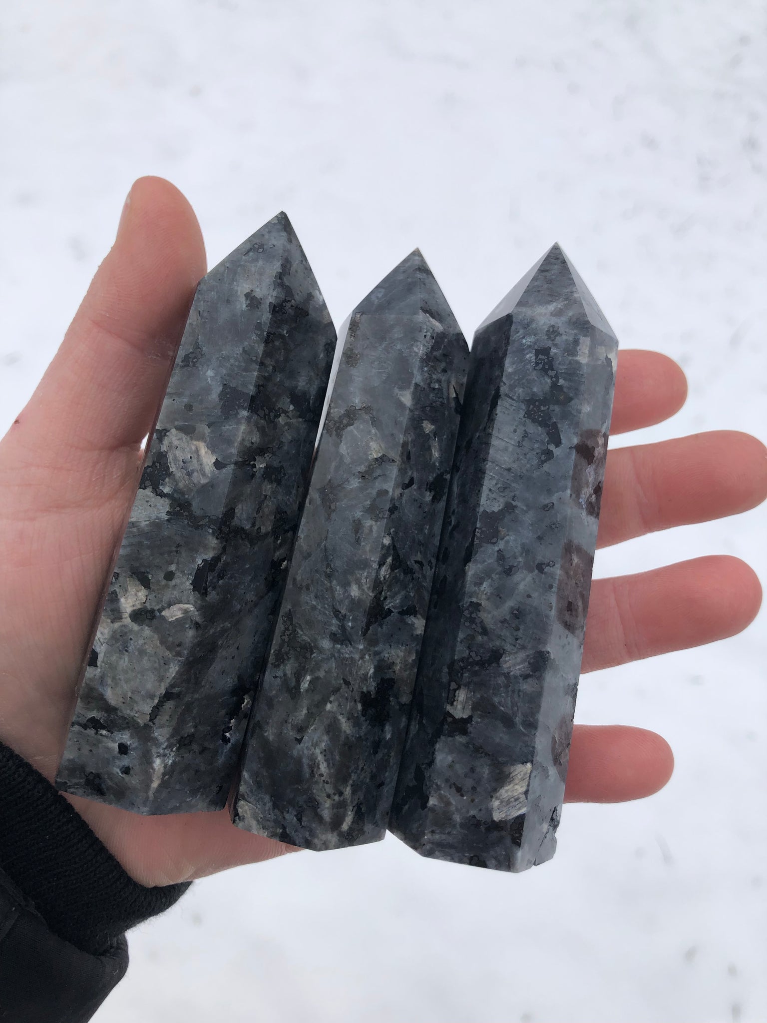 Larvikite towers. Larvikite brings strength, creativity & wisdom. Larvikite can also enhance psychic abilities. Amazing flashes! Please allow for natural variations. Size, shapes & colors may vary. You will receive one intuitively selected piece. Approximately 4” in height.