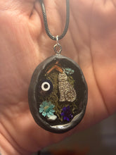 Witchy scrapbook/i-spy style necklace. Handmade with polymer clay & uv resin. Features witchy charms like an evil eye & kitty with moss & flowers too! We made the frame out of polymer clay & it’s a pretty black glitter! It makes a great background & really makes the piece pop. Uniquely wearable art. Necklace chain is a black wax rope chain & a different one can be used.