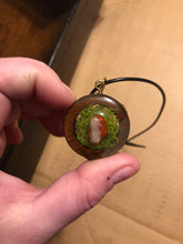 Wooden Moss Filled Crystal Necklace. Handmade with uv resin. These unique necklaces are filled with real preserved moss in a wooden frame w/ different crystals on top. Everything’s preserved with resin. The moss looks great held up to the light!